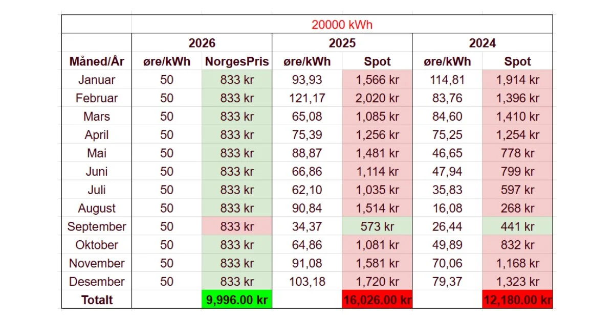 Publisert 27.09.25. Prisene de siste månedene i 2025 er basert på forventet pris i forhold til prisøkning tidligere måneder mot fjoråret, ca. 30%. For en bolig med et strømforbruk på 20.000 kWh i året, vil man spare flere tusen kroner i året på NorgesPris alene.